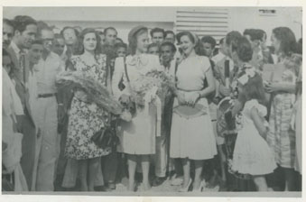 La Señorita Bolivar Piedad Gómez Román, a la llegada de la Señorita Santander del Sur, Sara Consuegra, en compañía de Blanca Aristizabal.