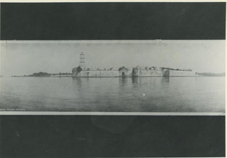 Se observa el fuerte de San Fernando en Bocachica con el faro.