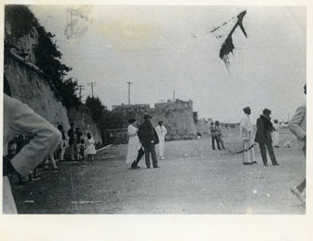 Personas en la plaza de la Independencia. Se observa cordón amurallado desde la Torre del Reloj hasta el Baluarte San Pedro Mártir (demolido).